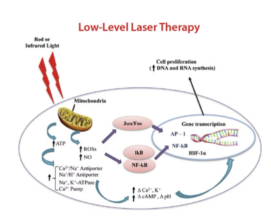 A diferencia de los láseres quirúrgicos o ablativos, la fotobiomodulación no produce calor ni daño tisular. Su acción se basa en la interacción fotónica con los cromóforos celulares, principalmente la citocromo c oxidasa en las mitocondrias, lo que genera un aumento de la producción de ATP, liberación controlada de óxido nítrico y modulación de especies reactivas de oxígeno. Estos mecanismos desencadenan una cascada bioquímica que puede influir positivamente sobre la función celular, la reparación de tejidos, la microcirculación y la respuesta inflamatoria.
